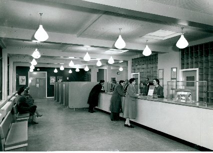 7 x photographs: public users in booths; modern interiors; Vacancies boards Minstry Of Labour