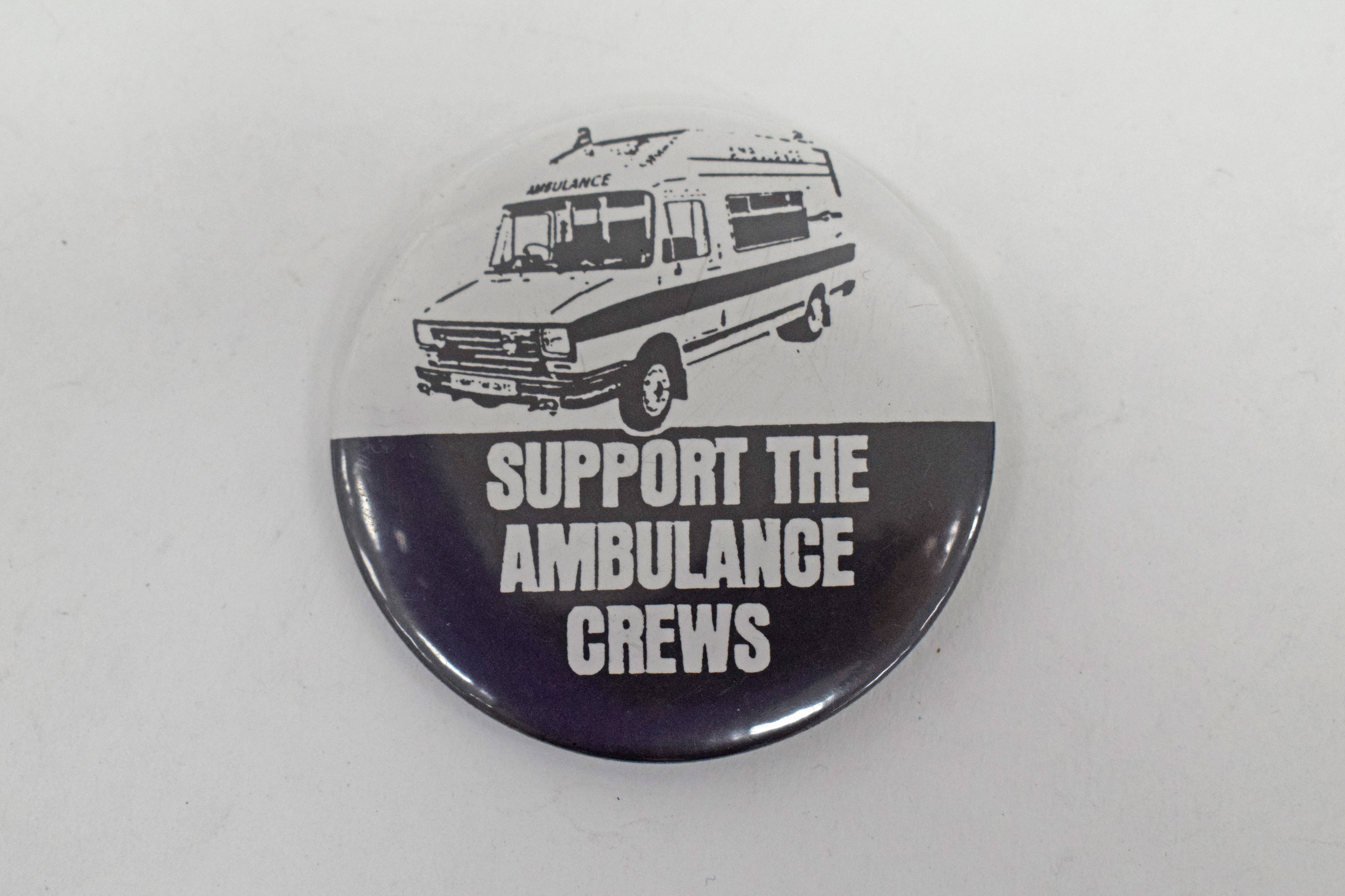 Circular white and black badge, "Support the Ambulance Crews" with an illustration of an ambulance at the top.