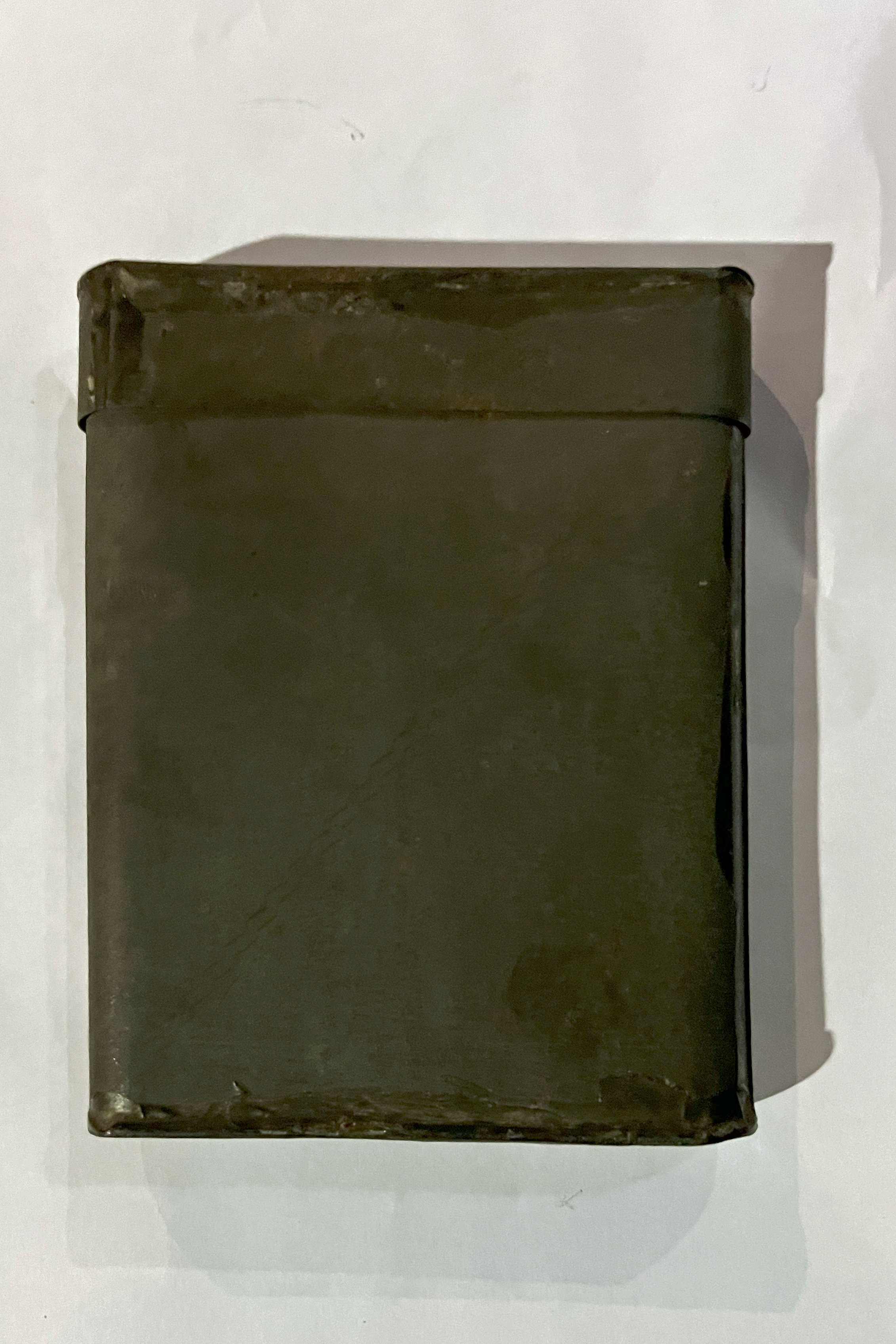 A Rectangular lidded metal tin for holding Robert Robson's indenture contract.