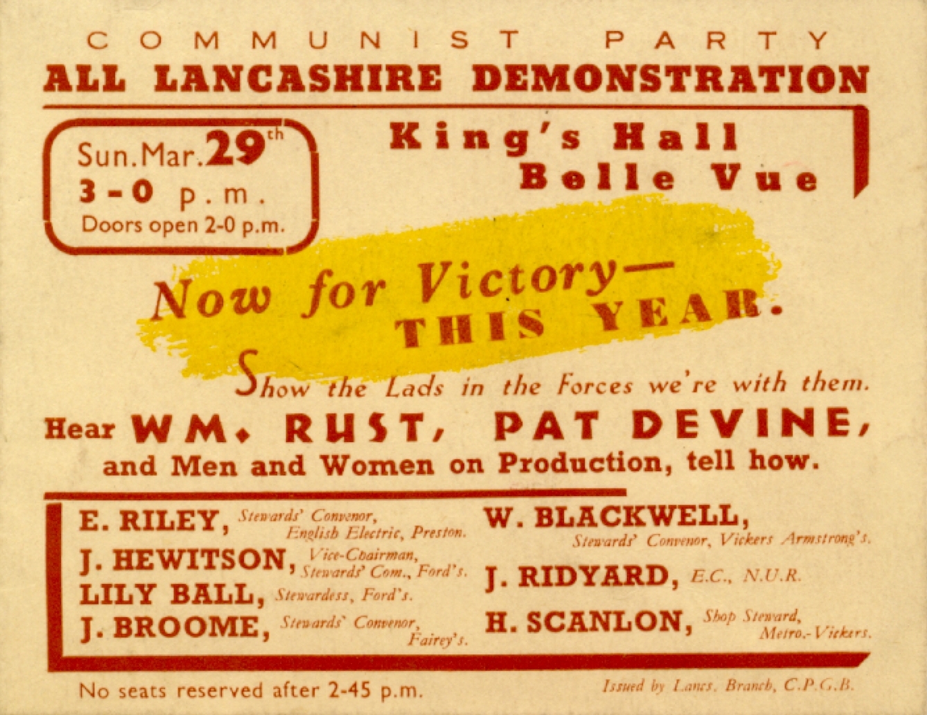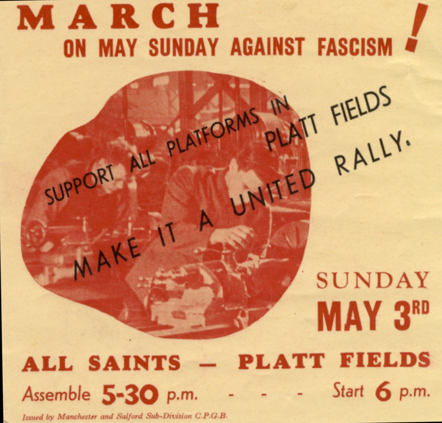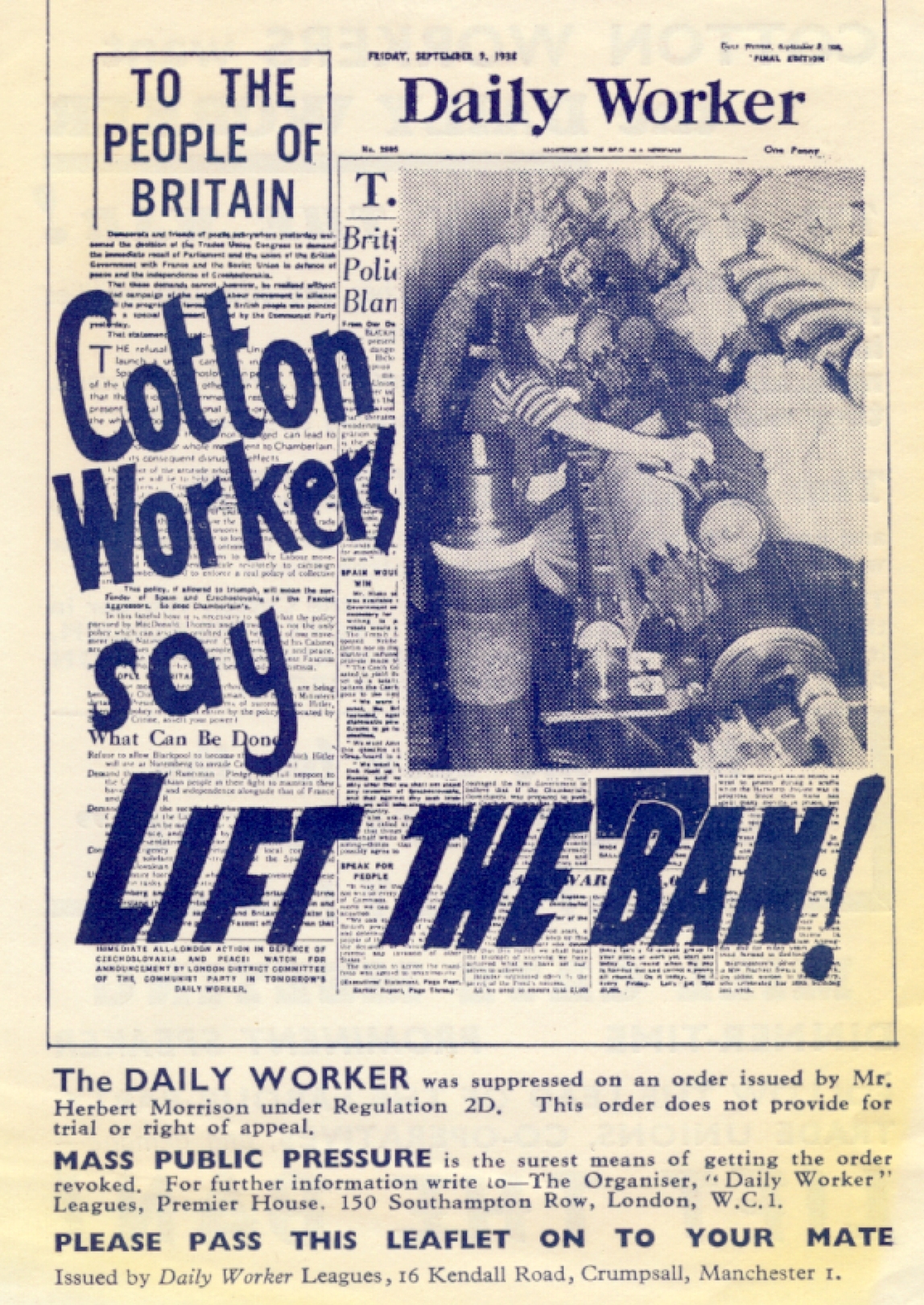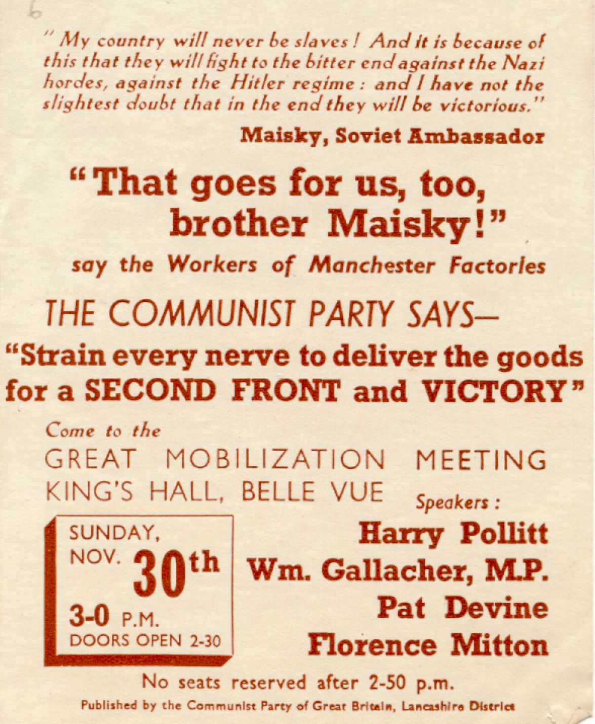 Following Hitler's massive invasion of the USSR in June 1941 The Communist Party of Great Britain produced a wide range of leaflets in their campaign to encourage the Allied forces to attack and defeat Hitler in Europe, opening up what was called a Second Front, and to aid the USSR. The party had an active membership in industrial Manchester and Lancashire.