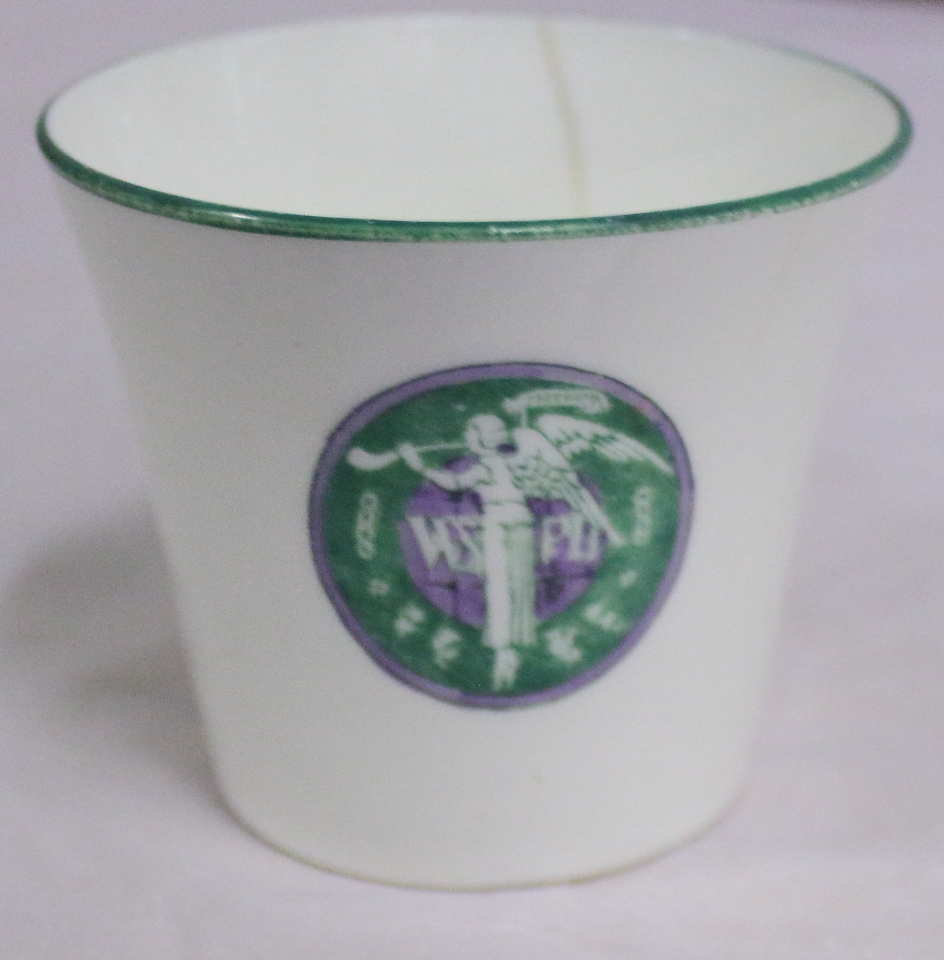 Ceramic cup, with angel blowing trumpet logo, green, purple border.