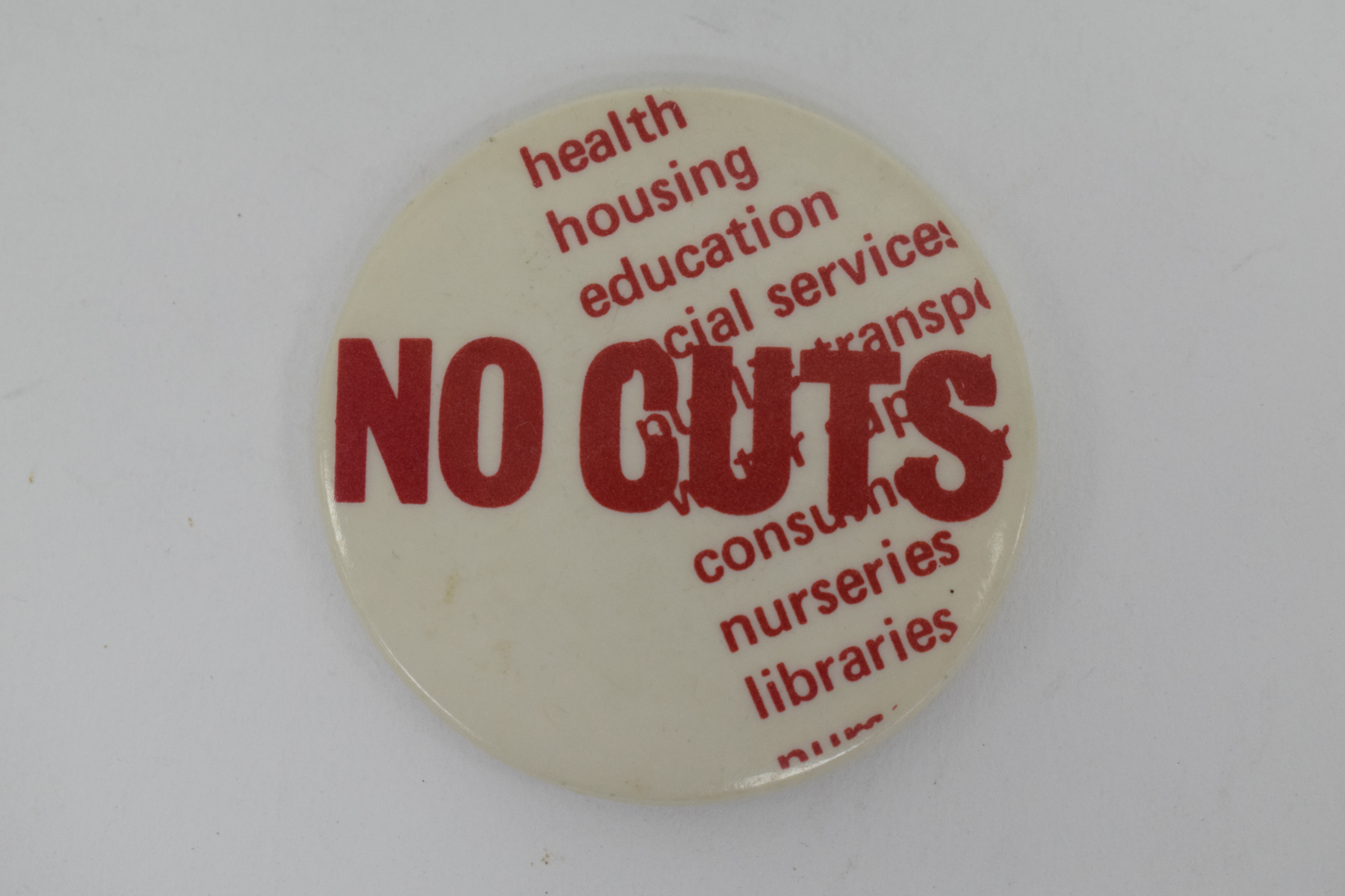 "No Cuts Health Housing Education badge" [NMLH.1991.28.7]