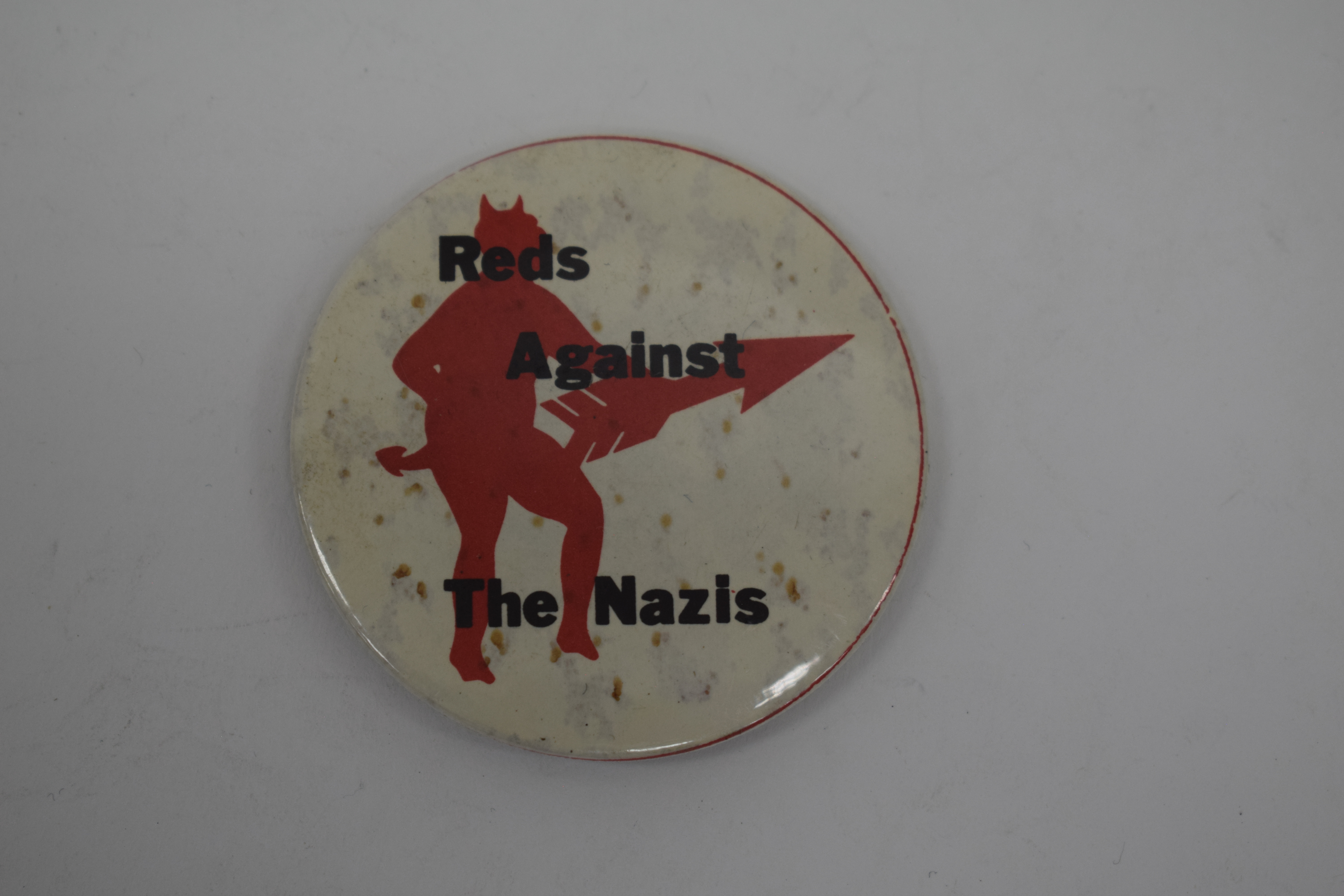 A white badge with the Manchester United red devil mascot holding an Anti-Nazi League red arrow. Over the illustration in black writing is: 'Reds Against The Nazis'.