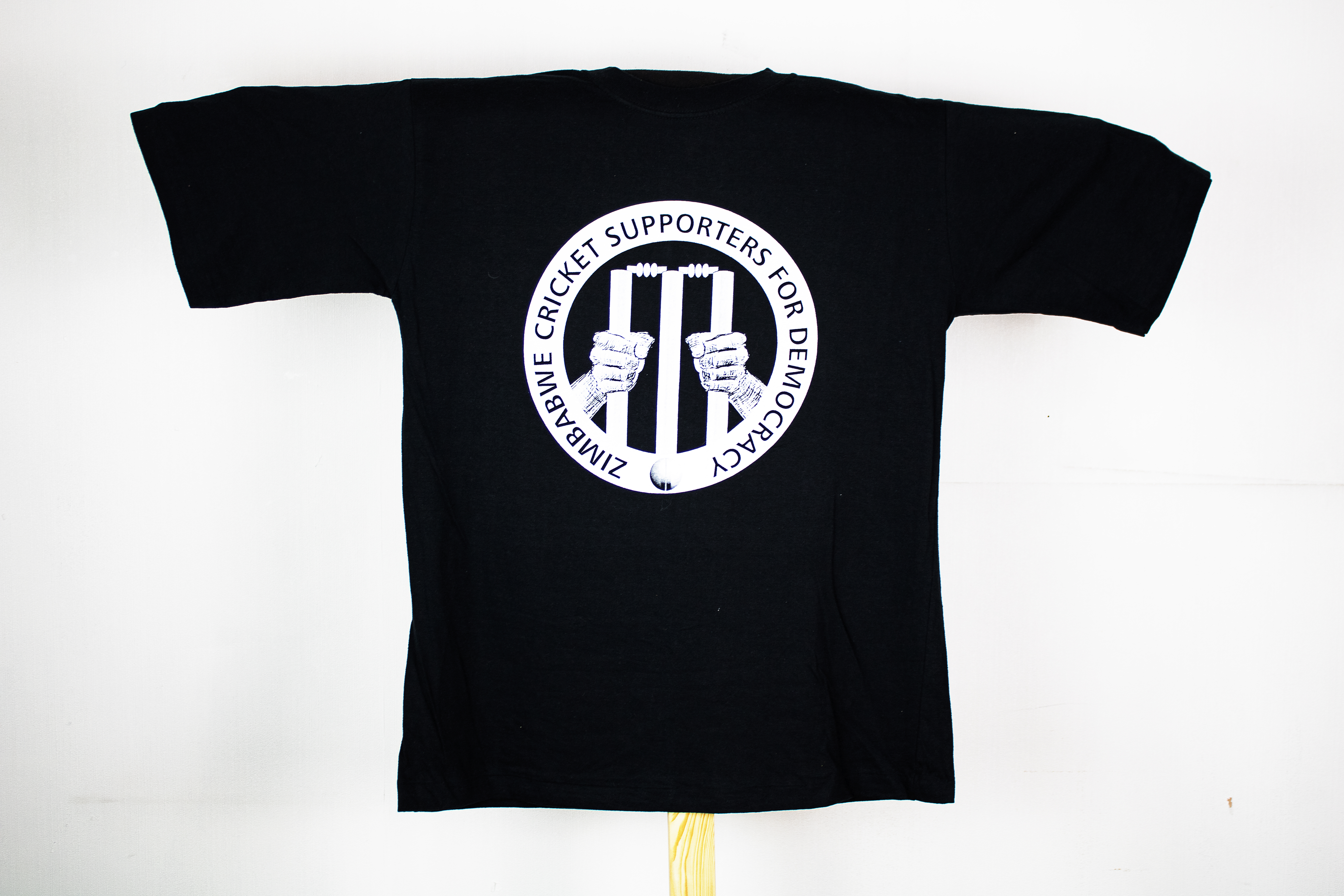 A black t-shirt with text reading "Zimbabwe cricket supporters for democracy" along with an illustration of hands grasping a wicket to resemble prison bars.