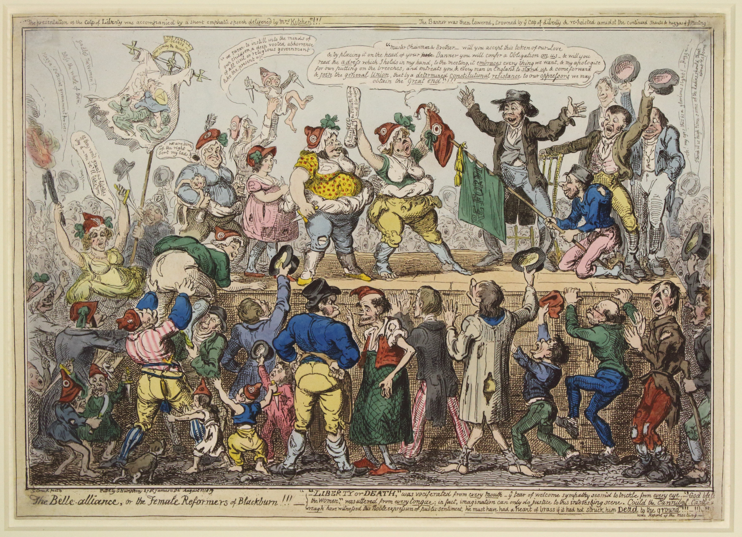 Many female reform societies, including Blackburn, attended Peterloo. Here Cruickshank depicts the women as grotesque parodies - at the time physical characteristics like the shapes of facial features were seen as a way to judge a person's character. Cruickshank is engaging in this pseudoscience which would have been familiar to much of his audience. By portraying the voting reform advocates as ugly and some as disabled, he may be implying they are incapable of rational thought and thus ineligable to vote. This sense of mocking continues with the print's title, as Belle is the French word for beautiful.