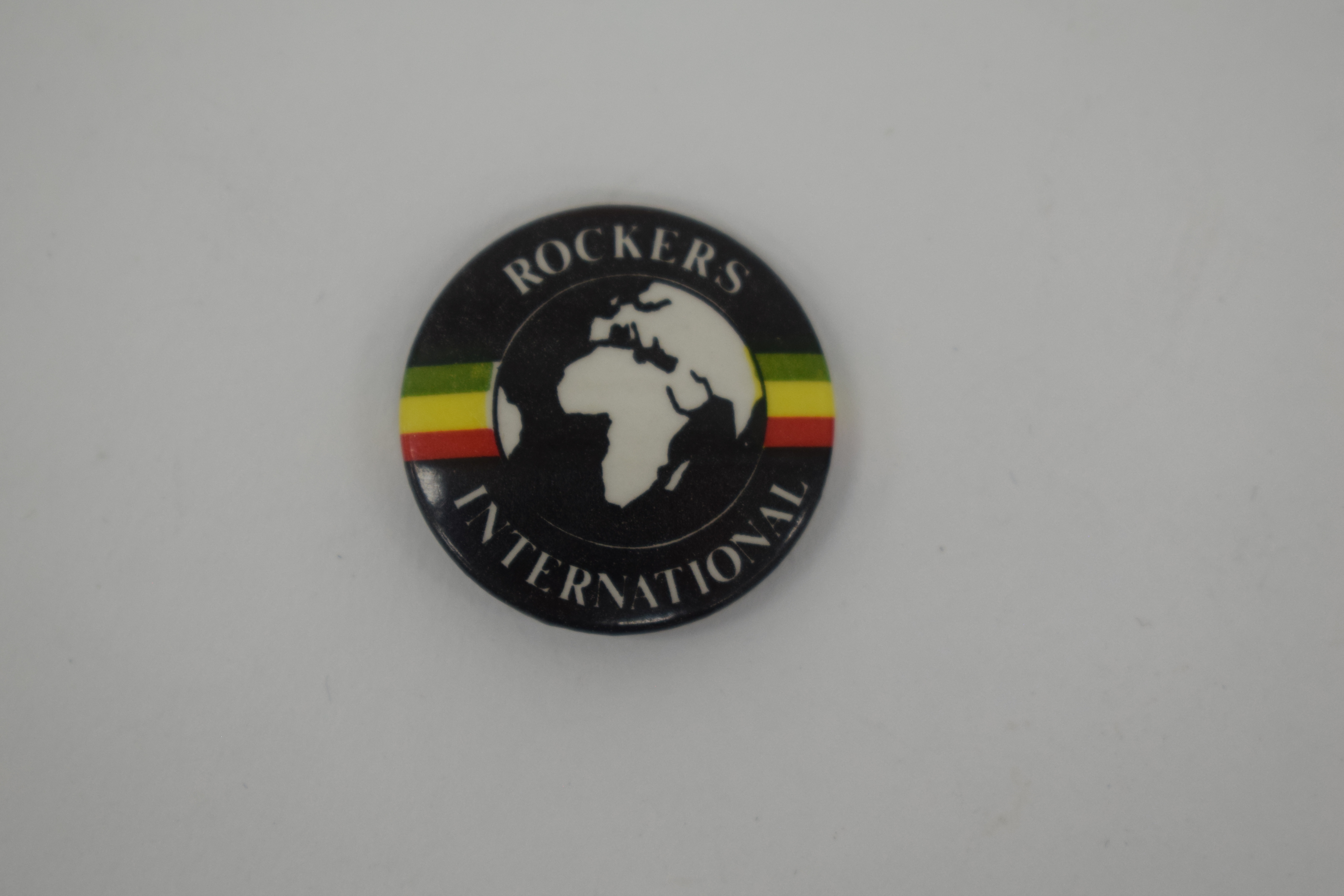 Black circular badge with a black and white globe, centred on Africa. Horizontal stripes of green, yellow and red cut across the middle. In white, "ROCKERS INTERNATIONAL" curves around the top and bottom edge of the badge.